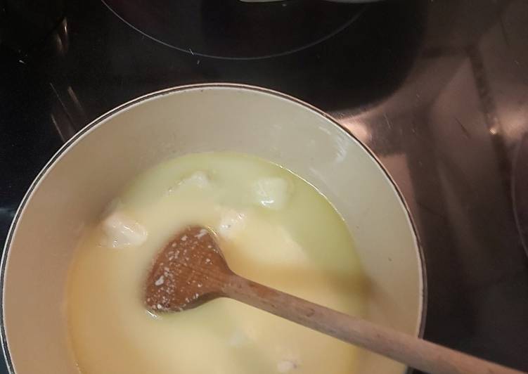 - En attendant, couper le fromage en cubes pas trop gros et une fois le vin chaud, verser petit à petit les cubes de fromage. Mélanger pour les faire fondre à feu moyen.